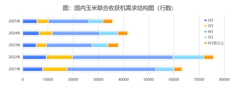 观察行业变化规律可见,4行机是绝对的销量主力,国内需求量最大;2行机萎缩最为显著。在大行业销量大幅下滑的背景下,6行及以上机型销量保持稳定,占比明显提升,这表明玉米联合收获机正朝着大功率、高效率、高价值方向发展。