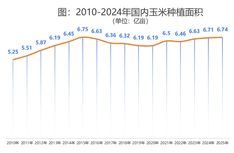 玉米收获机需求量与玉米种植面积正相关,因为只有种地才会用得到更多的农机。从下图可以看出,自2010年以来,国内玉米种植面积一直呈增长趋势,2020年之后国家更加重视粮食安全,鼓励农民种植产量和收益更高的玉米,其中2025年种植面积达到6.74亿亩,同比增加了330.1万亩,按照第一性原理,2025年与玉米相关的农机需求应该会增加,反之种植面积减少的农作物相关的农机需求会减少。