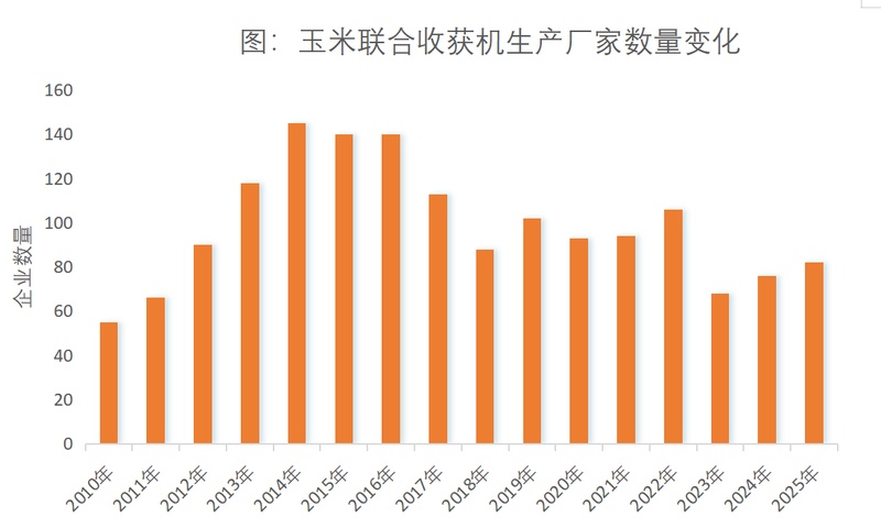 三大谷物联合收获机行业,轮式小麦机需求饱和,竞争格局固化,缺乏对投资的吸引力,所以近几年鲜有新鲜血液涌入;履带式水稻联合收获机行业与小麦联合收获机行业情况类似,只是竞争对手数量稍多,不过由于种植分散,不同品牌服务于特定用户群体,因此能够容纳更多生产企业;唯有玉米联合收获机行业,目前市场集中度不高,且玉米种植农艺区域差异显著,没有哪个品牌或产品能够独占市场,因此行业竞争格局相对分散,为新进入企业预留了成长空间,故而该行业仍保持较高活跃度,吸引了新企业不断加入,在三大联合收获类产品中成为投资者最为关注的农机品类。