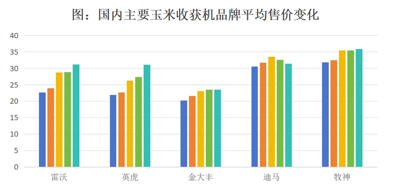另一个数据——单台年均销售价格,也能为此提供佐证。上图列举了近五年五个主要玉米收获机品牌所售出的机器的平均价格变化,从中可以看出几个趋势: