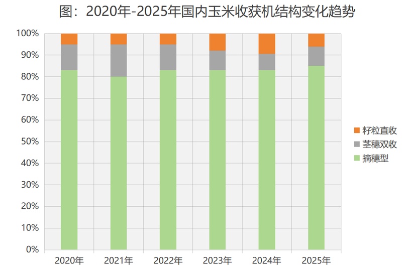 目前销量最大的是摘穗机、茎穗兼收机、籽粒直收机,从2020年到2025年,五年时间里,整体看茎穗兼收机的春天已经过去,在畜牧养殖业没有改观的情况下,接穗机重新获得了竞争优势,占有率呈恢复性增长态势,籽粒直收机仍然在反复振荡中,受政策的影响很大,同时与玉米种植规模化水平正相关,且受烘干、仓储等硬件条件的制约,迟迟难以突破10%的大关。