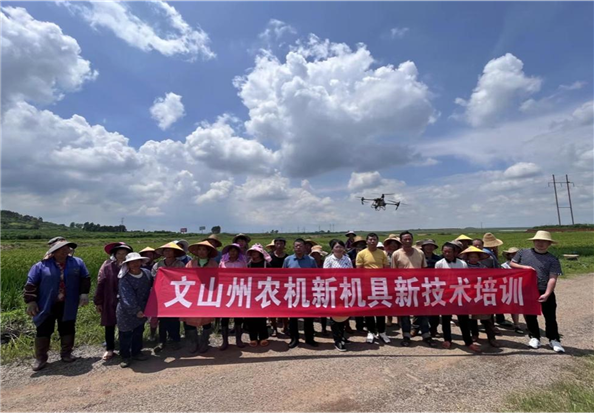 培训主要采取理论教学与现场示范教学相结合的方式。上午,在云南23度高原特色农业发展有限公司旱改水水稻种植基地,开展了植保无人机飞防作业培训,文山州农业机械技术推广站站长彭晶晶同志讲解了无人机在农业生产中的应用范围和优势等知识,让参训群众直观感受了植保无人机喷洒农药的全过程,切实感受了植保无人机在飞防使用中的高效与便利。
