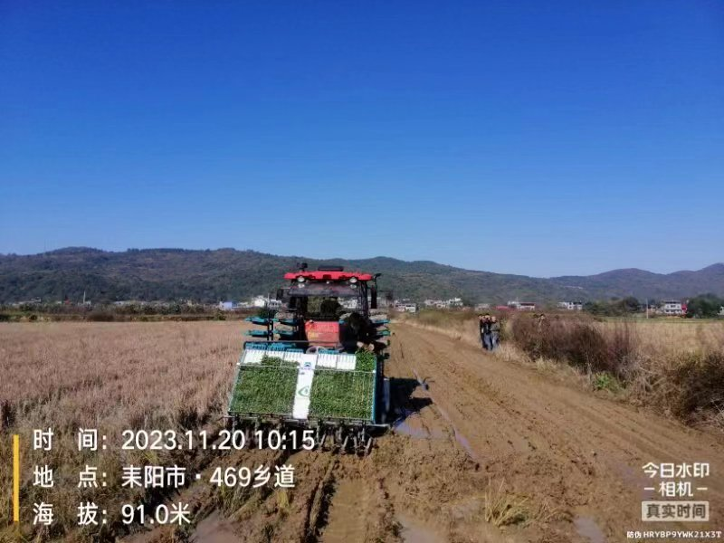 11月20日,天气晴朗,湖南衡阳耒阳市2023年油菜首次机械化移栽现场演示会在小水镇四都村举行。在演示现场,一块块育好的、像草毯一样的油菜秧苗整齐地摆放在油菜移栽机上,农机手驾驶着油菜移栽机在田地里匀速行驶,快速将油菜苗准确地插到泥土里。一会功夫,一垄垄整齐的油菜苗便呈现在众人眼前。