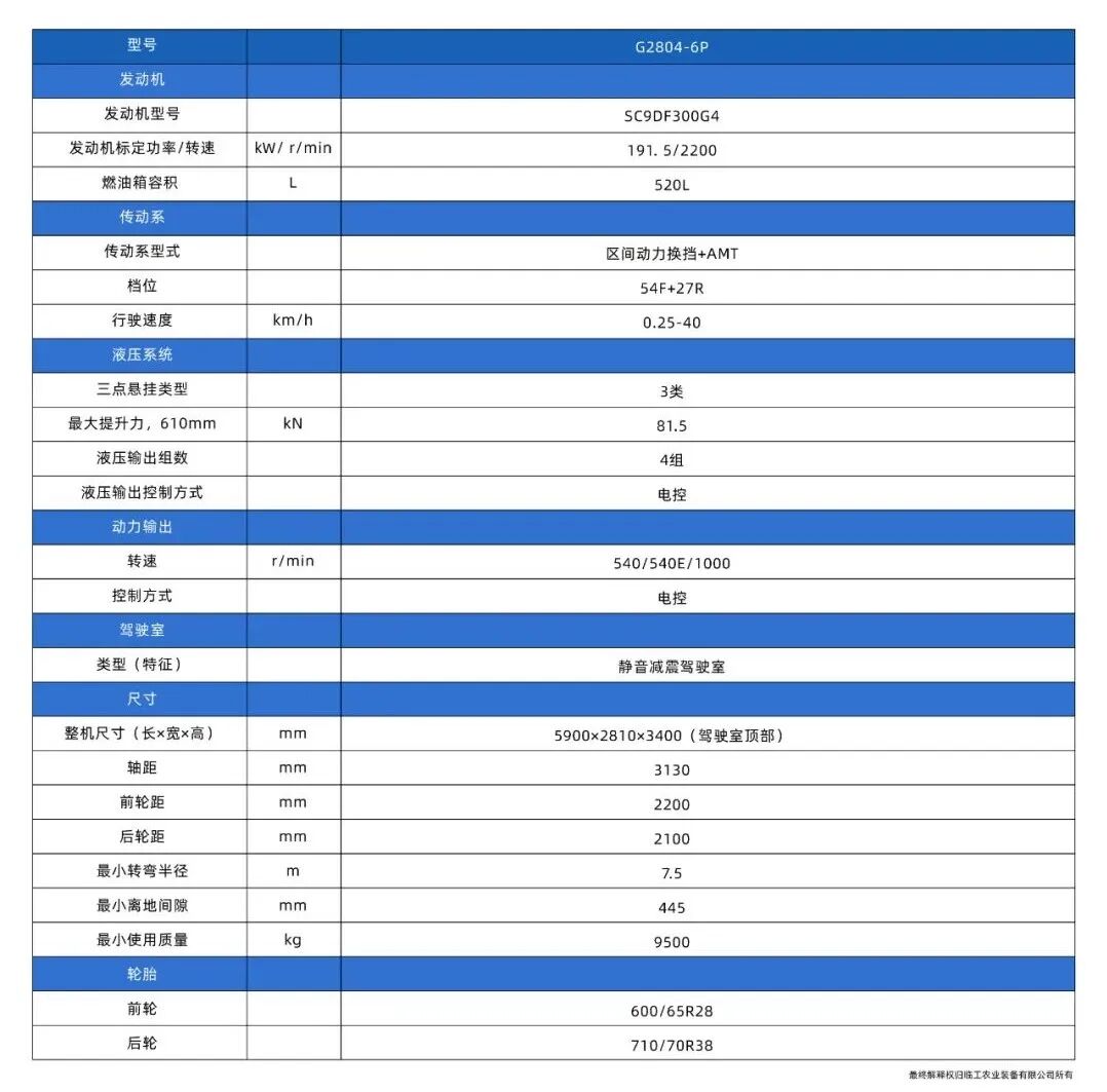 •24+8档变速箱,带爬行档,速度0.33-34.7km/h,作业速度覆盖广。