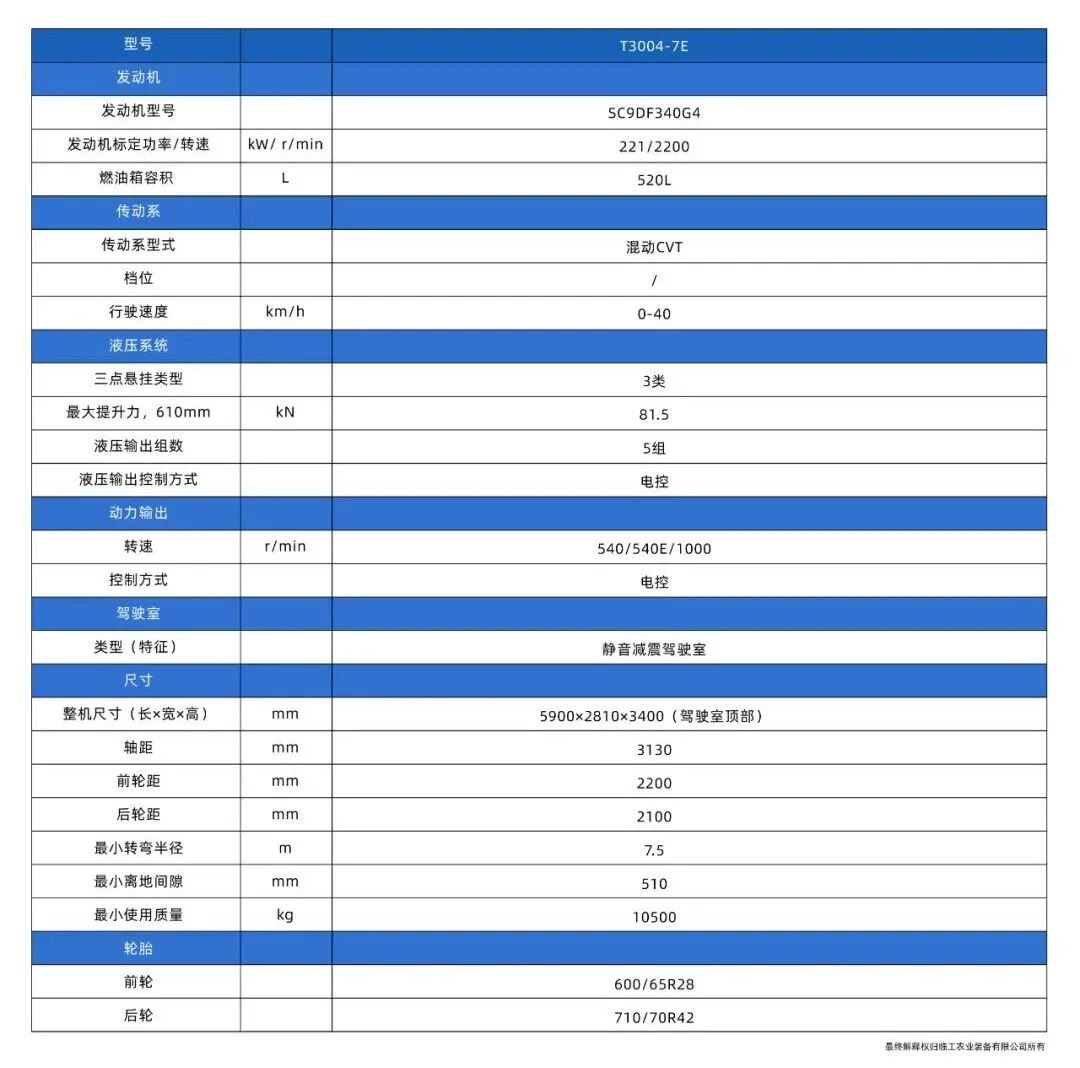 该平台是大中型农场高端产品的首选,国内首发EMCVT混动无级变速拖拉机,涵盖280-300马力,目前包含7E一个系列,0-40km/h无级变速,驾驶舒适、智能化程度高。适用于犁地、深松、整地、播种、打包等作业。