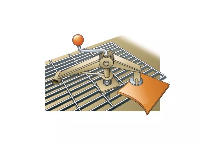 焊接台夹 在 50 年的制造过程中,这可能是农民为自己维修车间制作的最方便的工具,并且每天都会使用它。他拿了一个 1x1x2 英寸的钢块,并钻了一个孔,供 1/2 英寸的螺栓滑过。在这个块的每一端,焊接了一块约 3/4 英寸长的 3/4 英寸冷卷。他将两块 1x2x⅛ 英寸的角铁(一块约 6 英寸长,另一块约 12 英寸长)切成三角形,如下图所示。接下来,我将两个 3/4 英寸的垫圈放在冷滚销上,并将它们焊接到角铁上,如图所示。这使得手臂可以根据被按压物品的大小进行枢转。您可以将手柄焊接到螺栓末端或使用棘轮。夹子固定在桌子上的方式不同,具体取决于您的工作台是实心金属工作台还是有格栅的桌面;插图显示了一个磨碎的顶部。对于实心金属工作台,只需在工作台上钻孔并攻丝即可容纳 1/2 英寸螺栓。