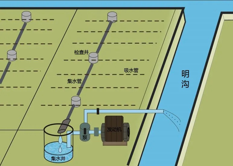 明暗结合系统:暗管控渍 + 明沟集水