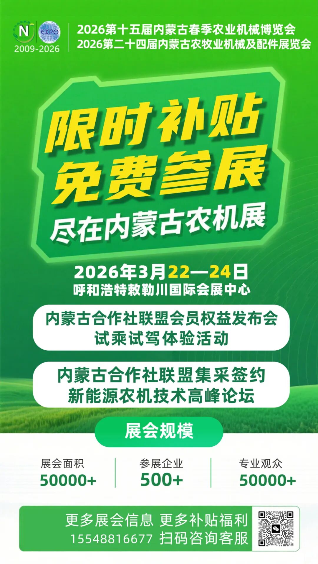 2026年内蒙古农机双展——汇聚全球智慧,驱动农业未来!无论您是农机企业、经销商,还是合作社、种植大户,这里都是您拓展市场、采购设备、交流技术的最佳选择!3月呼和浩特,我们不见不散!