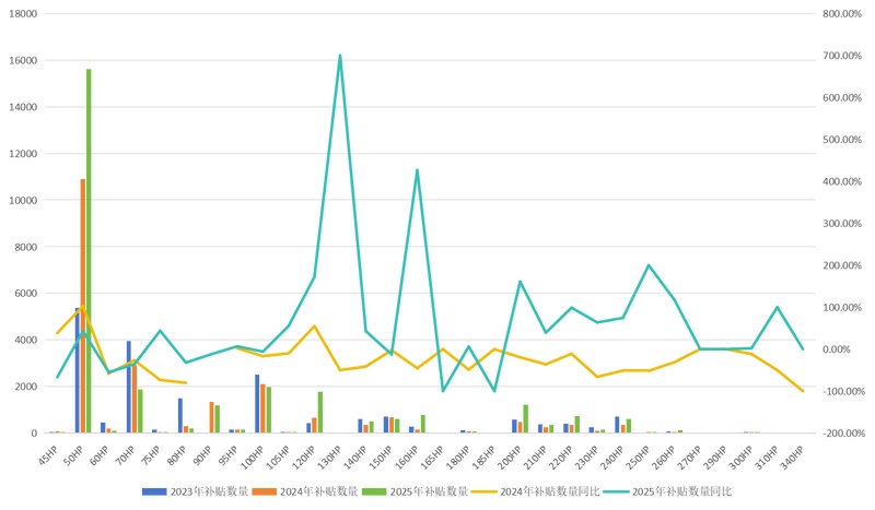 · 主力变迁:在2023年,50HP和70HP是销量冠亚军;而到了2024年,50HP销量破万,一骑绝尘,同时100HP、120HP、140HP等大马力机型销量同比显著增长。进入2025年,大马力趋势更为明显,200HP、220HP、240HP等重型拖拉机销量与占比迅猛提升。