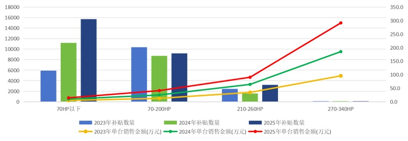 三年间,年度补贴总金额随着销量和单机价格的上涨而大幅增加。更为关键的是,大马力机型的单台平均补贴额显著高于中小马力机型。例如,2024年240HP拖拉机的平均单台补贴额约是50HP机型的2倍以上。这种“阶梯式”的补贴设计,有效降低了用户购置高性能机具的门槛,直接撬动了动力升级。