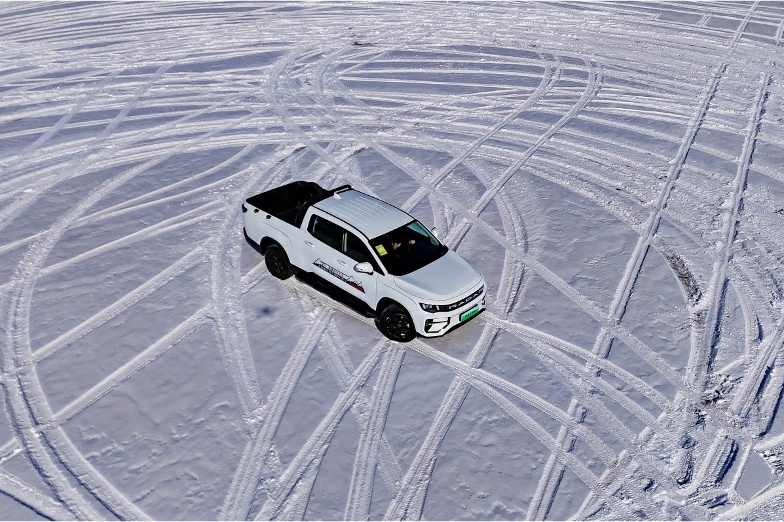 而地平线PHEV高寒版的1档轮端最大扭矩8620N·m得以充分释放,电机与发动机双动力加持的智能四驱系统,搭配雪地专属模式与全地形AT胎,起步稳健不溜车,即便在冰雪覆盖的田间道路或牧场空地发生陷车,快速的脱困扭矩响应也能瞬间助力脱离困境。全程试驾中,两款车型的动力系统均未出现任何衰减迹象,相比传统燃油皮卡明显的动力衰减,用实际表现印证了“极寒不减劲”的产品实力。