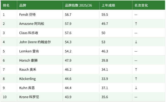 农业机械前十名格局出现新变化。芬特(Fendt)蝉联榜首,阿玛松(Amazone)凭借强劲表现升至第二,科乐收(Claas)和约翰迪尔(John Deere)位列三、四位,雷肯(Lemken)和豪狮(Horsch)保持原有位次。Köckerling 与奥禾(Rauch)一同新晋前十。