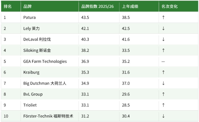 与此同时,斯诺金(Siloking)、BvL 和 Trioliet 三家饲料搅拌车制造商集体跻身前十。在生猪和家禽养殖户群体中,大荷兰人(Big Dutchman)稳居首位。莱力(Lely)则在北部地区及品牌形象维度持续保持领先。