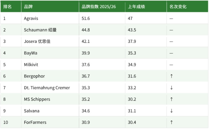 从区域来看,BayWa 在德国南部超越 Agravis 位居第一,Milkivit 也以第三名跻身前三。优思佳(Josera)在南部和西部保持第二,而在东部地区,BAT Agrar 凭借该领域最大的分值增长升至第三。