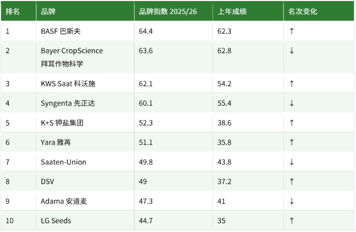中段排名变动较为明显:德国钾盐集团(K+S)再次上升两位;雅苒(Yara)更跃升四位——这家化肥专家去年才刚刚首度跻身前十;DSV 和 LG Seeds 亦呈上升态势。