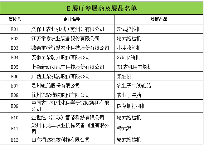 E展厅为室内特装展厅,展示企业包括久保田、潍柴雷沃、中国农机院、江苏常发、英轩重工、安徽全柴、上海新动力、广西玉柴、贵轮、徐轮、郑州龙丰等内外资骨干整机及零部件企业,展示产品包括轮式拖拉机、谷物收获机、玉米收获机、插秧机、柴油机、轮胎、液压翻转犁、打捆机等。