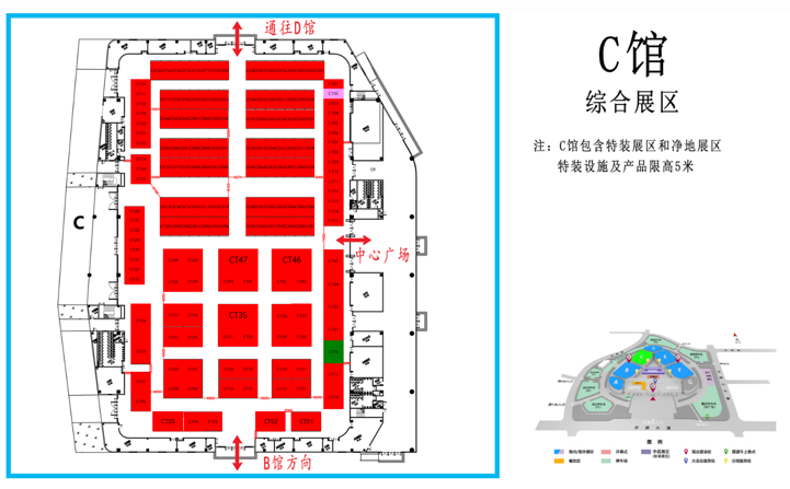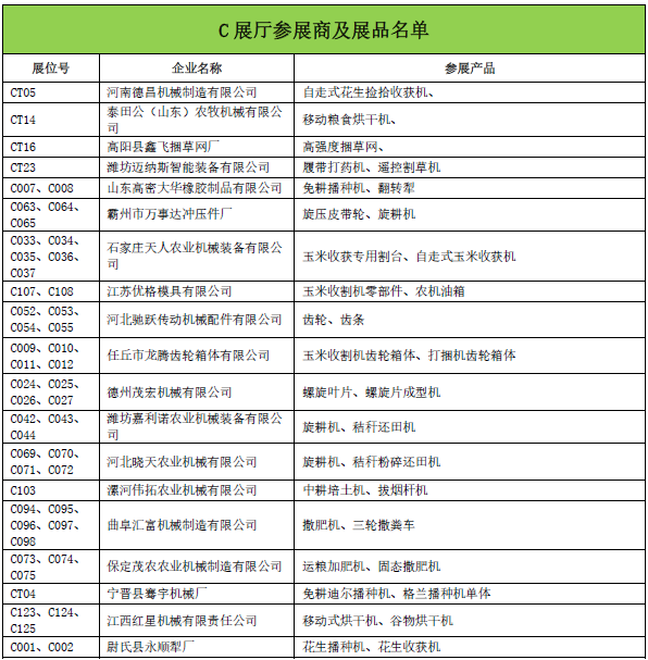 C展厅包含室内特装区和净地展区,特装设施及产品限高5米,设置特装展位49个,净地展位133个,展览面积8200平,展示企业91家,展示企业包括河北农哈哈、河南德昌、石家庄天人、锐牛股份、新乡立广、南通卓越、河北黑一等整机及零部件企业,展示产品包括:自走式花生捡拾收获机、移动粮食烘干机、玉米收获专用割台、传动胶带、弹簧弹齿、喷灌机、播种机、割草机等产品。