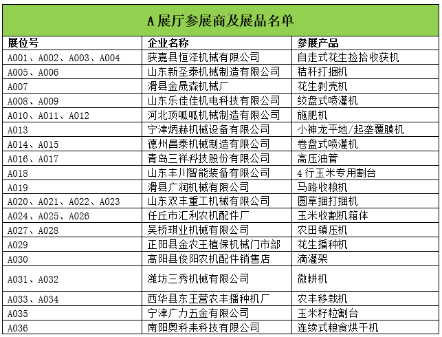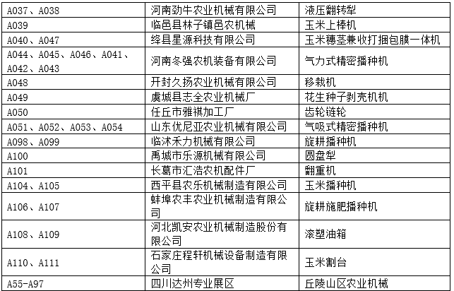 A展馆全部为室内净地展位,设置展位111个,参展商包括34家农机企业和四川达州专业展区,展示产品包括液压翻转犁、玉米播种机、移栽机、打捆机、施肥机、割台等农机产品。