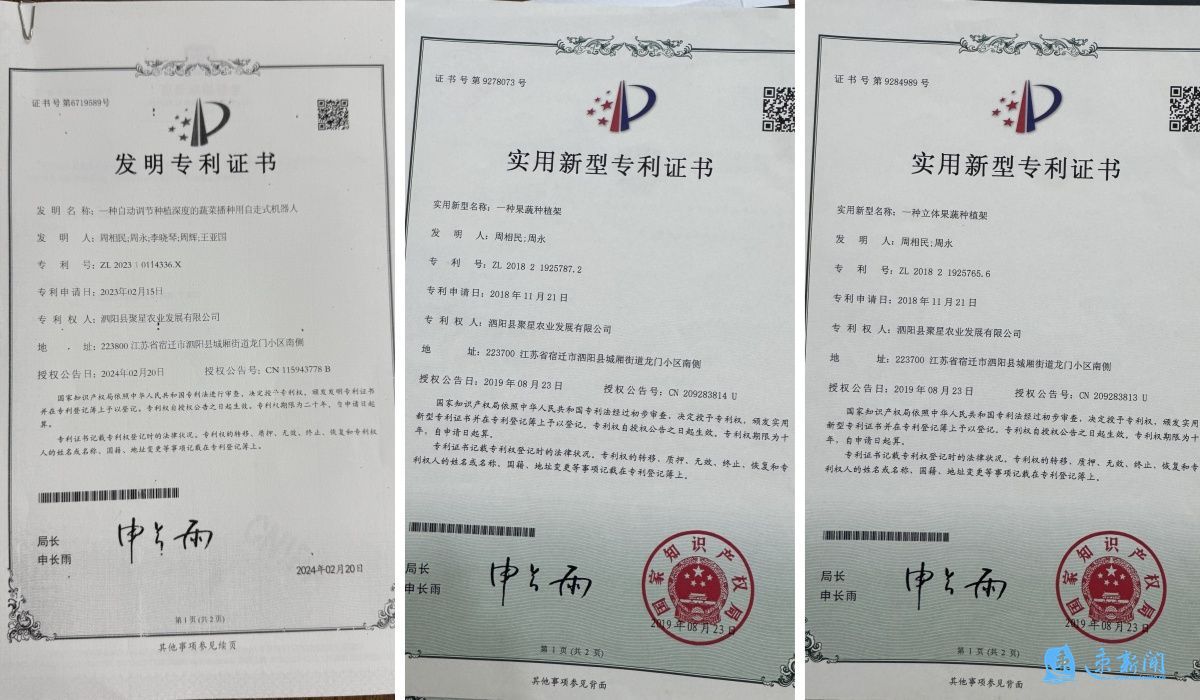 农民给西红柿浇水需要长时间弯腰,那就让支架自动“吐水”;土豆清洗后易氧化,那就设计具备清洗加沥干功能的水池;人工播种深浅不一,那就造台会“思考”播种深度的机器人……在百春锦蔬菜合作社的工作室,周相民多年来获得的32本国家发明专利证书铺满了整个办公桌。其中最早的专利要追溯到20世纪90年代,周相民根据太阳能热水器蓄水常常漫水的问题,发明了自动关水装置。这个看似与农业无关的专利,却让他摸到了“用机械思维解难题”的门道。
