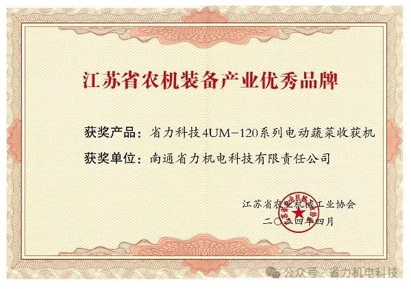 2021年9月,省力科技4UM-120电动叶菜收割机获“中国农业机械年度TOP50+应用贡献奖”;2023年12月,省力科技4UM-120系列电动蔬菜收获机荣获“农机行业创新产品奖”!大会期间,江苏省农机工业协会、江苏省农业机械学会共同发布了《江苏省农机装备产业高端产品目录》(第一、二批),省力科技2ZG-6DMF乘坐式高速插秧机、省力科技3ZSG-6A水田除草机、省力科技4UM-120蔬菜收获机入选目录。