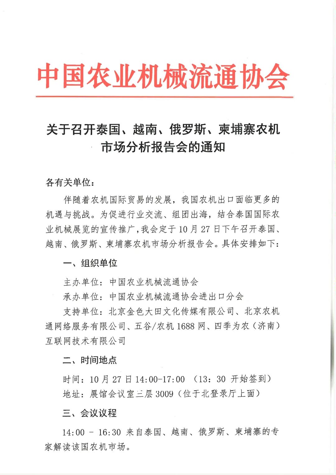 为促进行业交流、组团出海,结合泰国国际农业机械展览的宣传推广,中国农业机械流通协会定于10月27日召开泰国、越南、俄罗斯、柬埔寨农机市场分析报告会。