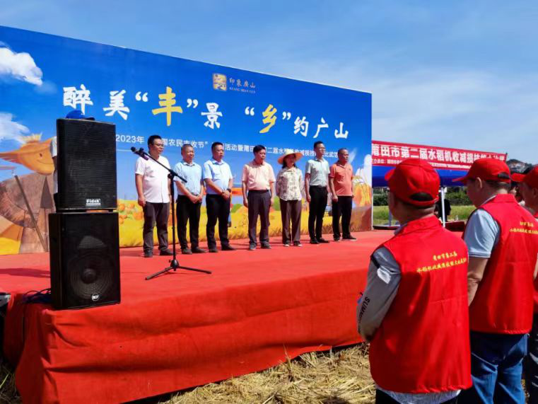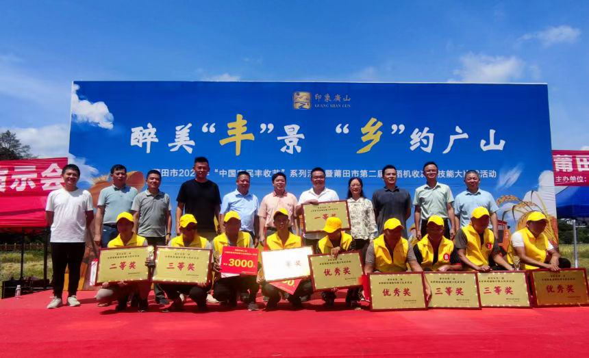 春种一粒粟,秋收万颗子。在丰收节期间,福建省莆田市第二届水稻机收减损技能大比武活动如期在涵江区白沙镇广山村兴田生态农业有限公司水稻种植基地举行,拉开了莆田市2023年“中国农民丰收节”系列活动序幕。省农业农村厅农机化处杨斌处长、林雪兰一级调研员、市农业农村局陈朝阳副局长到场参观指导,并为获奖选手颁奖。