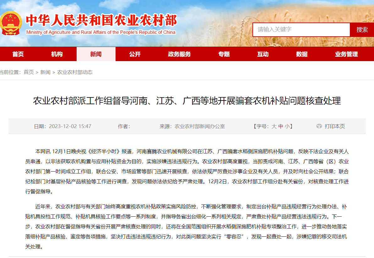 对于央视的上述报道,农业农村部表示高度重视,当即责成河南、江苏、广西等省(区)农业农村部门第一时间成立工作组,联合公安、市场监管等部门迅速开展核查,依法依规严厉查处涉事企业及有关人员,并及时向社会公开结果;联合纪检部门对基层补贴产品核验等工作进行调查,发现问题依法依纪给予严肃处理。