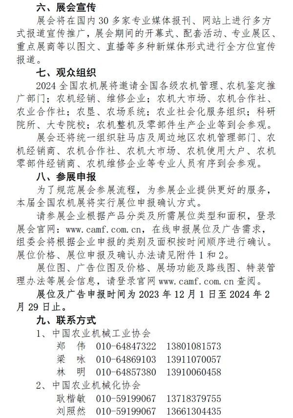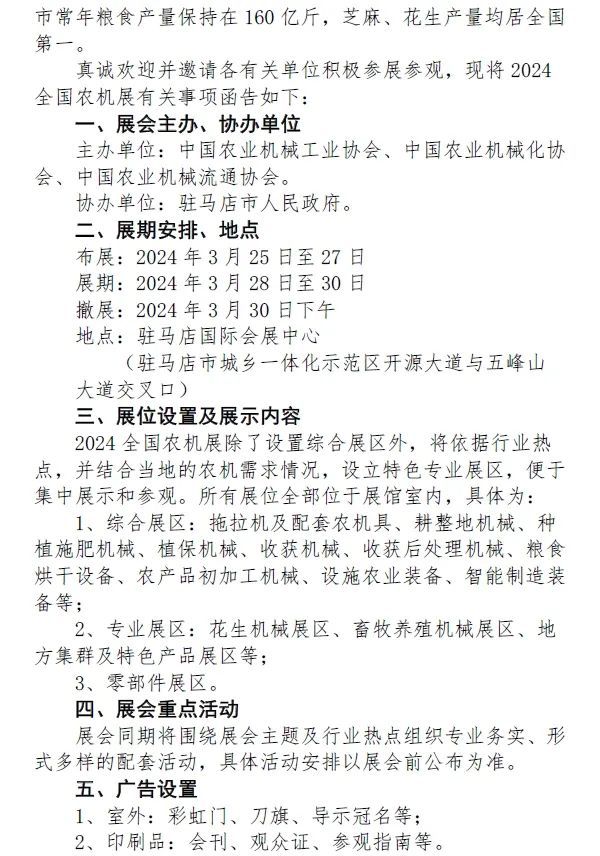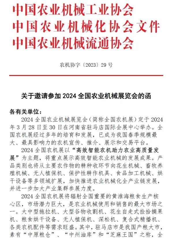 2024全国农业机械展览会将于2024年3月28—30日在河南省驻马店国际会展中心举办,有关展会的各事项如下,诚邀有关各单位积极参展参观。