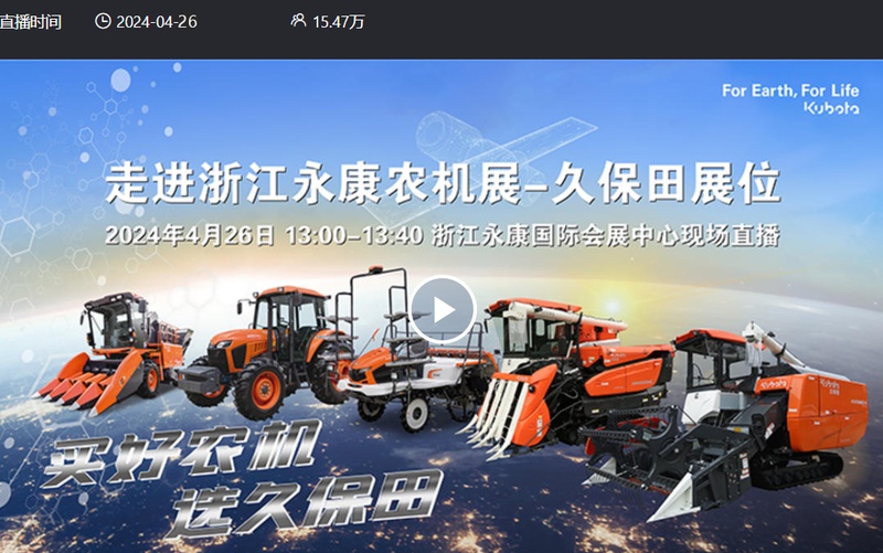由中国农业机械化科学研究院集团有限公司、中国农业机械学会、浙江中国科技五金城集团有限公司主办的第二届中国丘陵山区农业机械博览会暨中国(永康)国际农林装备博览会于4月26日开幕。当日下午1:00,农机TV携手久保田农业机械(苏州)有限公司进行了一场精彩直播,走进永康农机展“第一现场”。在时长约60分钟的直播活动中,截至发稿前共吸引15万余人次观看。