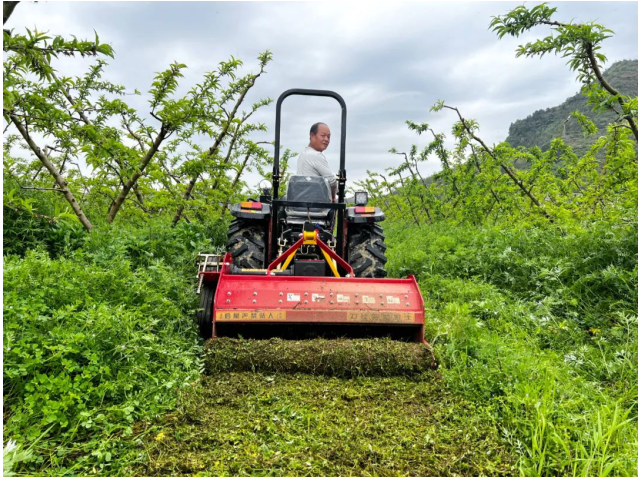 果农驾驶除草喷洒一体机对果园进行管护作业