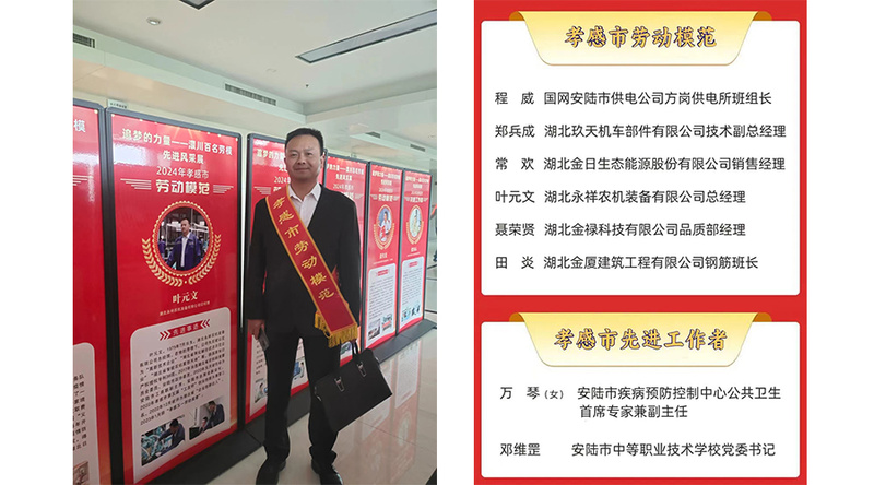 4月30日上午,孝感市隆重召开庆祝“五一”国际劳动节暨2024年孝感市劳动模范和先进工作者表彰大会授予65名同志“孝感市劳动模范”荣誉称号、34名同志“孝感市先进工作者”荣誉称号,其中,湖北永祥农机装备有限公司总经理叶元文荣获“孝感市劳动模范”称号。