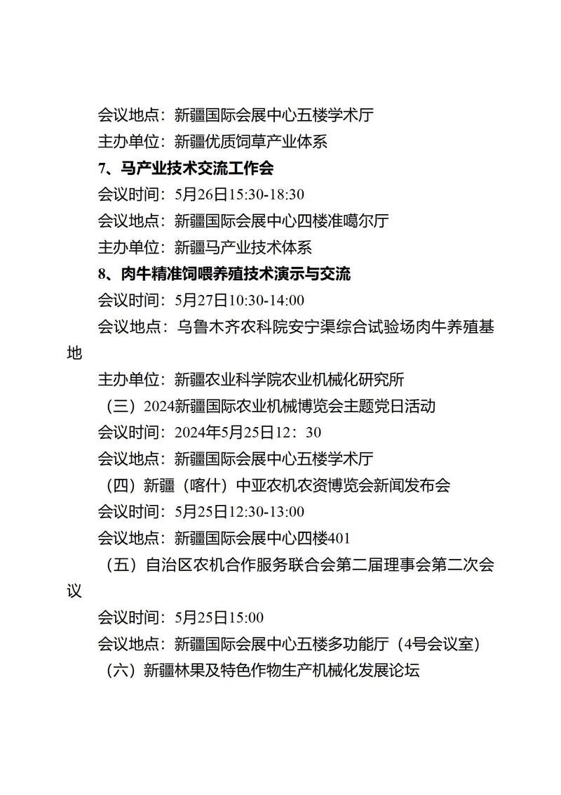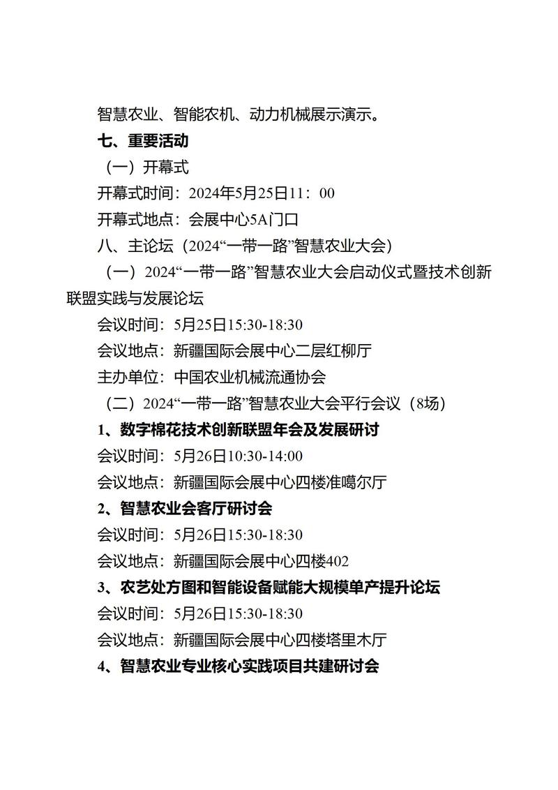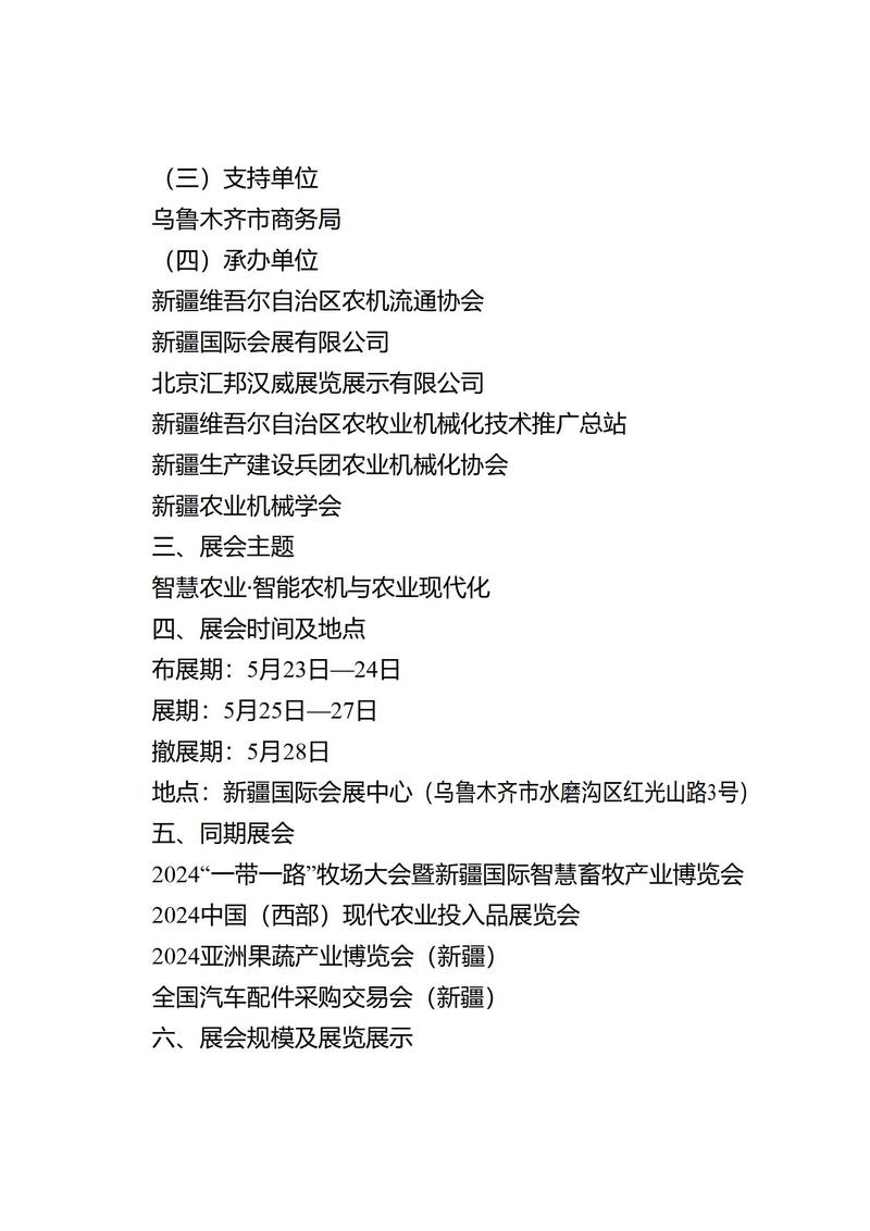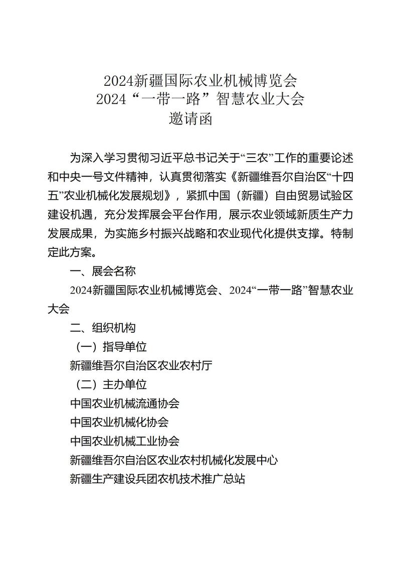 2024年新疆国际农业机械博览会及“一带一路”智慧农业大会将于5月23日至5月27日在乌鲁木齐举行。主题为“智慧农业·智能农机与农业现代化”,由多个机构主办,涵盖政府部门、行业协会及企业。展会将邀请国内外专家、企业家和政府代表,展示智能农机技术、农业现代化方案,并促进农业机械化国际贸易与合作。展会期间还将举办座谈会,讨论中国企业在中亚五国开展贸易、投资与合作项目。