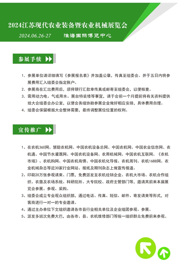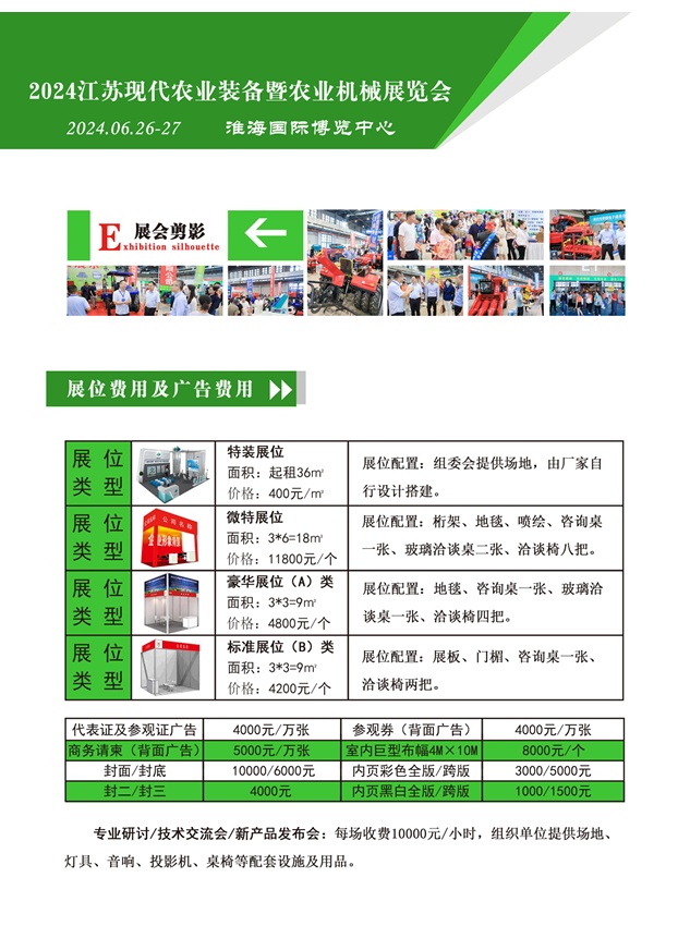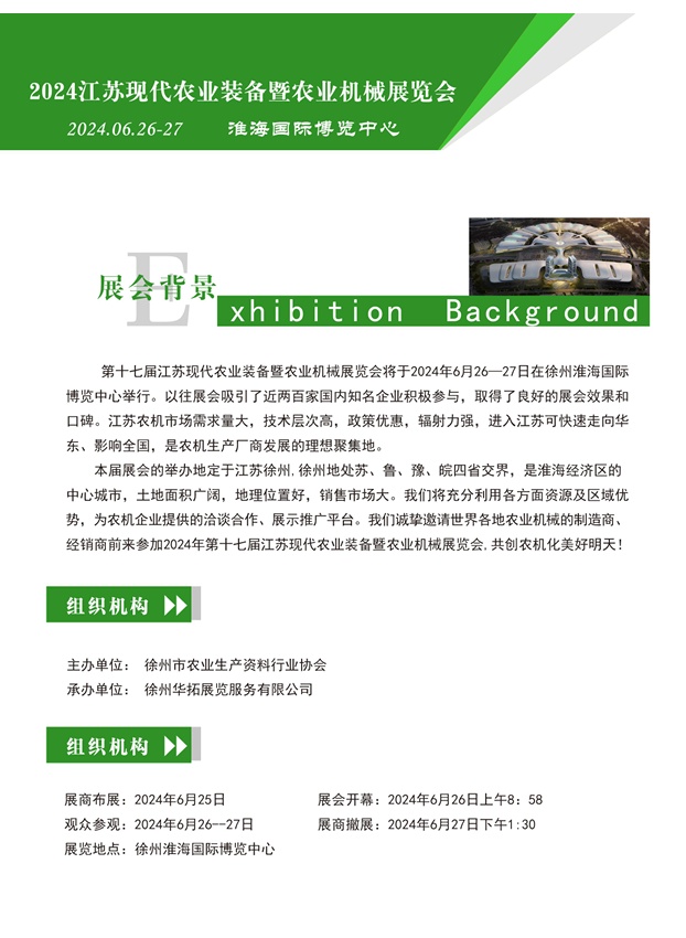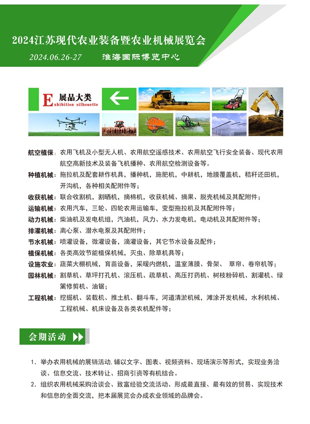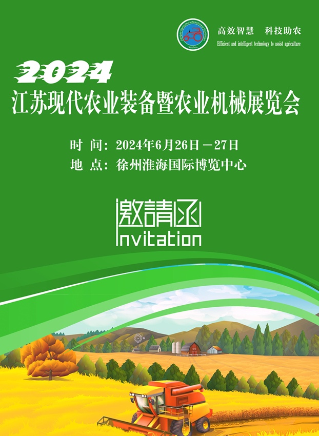 第十七届江苏现代农业装备暨农业机械展览会将于2024年6月26-27日在徐州淮海国际博览中心举行。诚邀世界各地农业机械制造商、经销商前来参展。