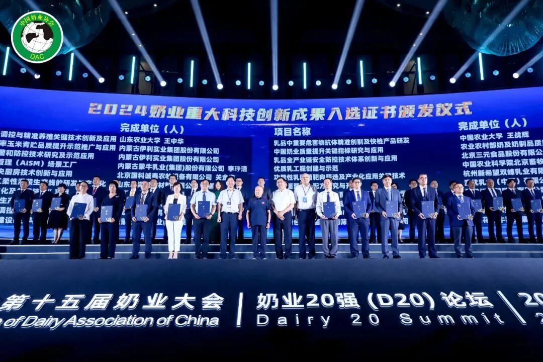 通知指出,根据征集工作要求,经自主申报、秘书处审核和专家评审等环节,最终评定,中国农业科学院北京畜牧兽医研究所王加启等人完成的“奶牛用红三叶草提取物新饲料添加剂创制”、中国农业大学李胜利等人完成的“奶牛母子一体化营养调控和标准化养殖技术开发与应用”、中国农业科学院饲料研究所李秀波等人完成的“奶牛高发病防治系列新兽药创制与应用”和中国农业大学王战辉等人完成的“乳品中重要危害抗体精准创制及快检产品研发”等41个项目入选2024奶业重大科技创新成果。