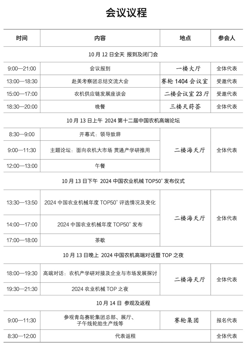 据悉,大会同期还将召开2024赴美农机考察总结分享会、农机供应链发展座谈会、2024第十二届中国农机高端论坛、2024中国农机高端对话暨TOP之夜,并参观青岛赛轮集团总部、展厅、子午线轮胎生产线等。