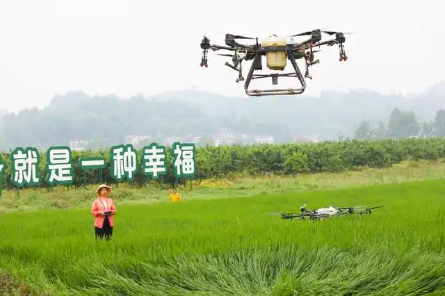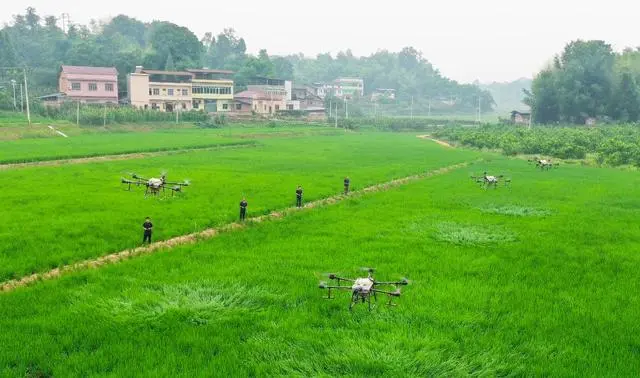 6月24日,梁平区仁贤街道五一社区,蒋丽英团队的无人机飞手操作植保无人机进行水稻施肥、喷药社会化服务。特约摄影 刘辉