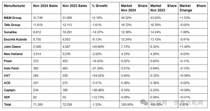 M&M集团(马恒达拖拉机) 2024年11月销量为31,746台,较2023年11月的31,069台增长2.18%。其市场份额从43.00%增至44.52%,提升1.53%。M&M 集团继续主导国内拖拉机市场,巩固了其领先制造商的地位。