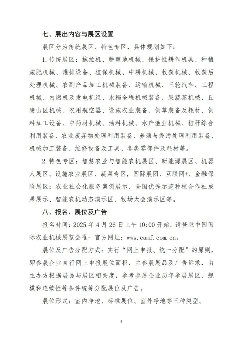 广告形式及价格、展会所有材料及规定,请登录中国国际农业机械展览会唯一官方网址:www.camf.com.cn“资讯动态”查询和下载。