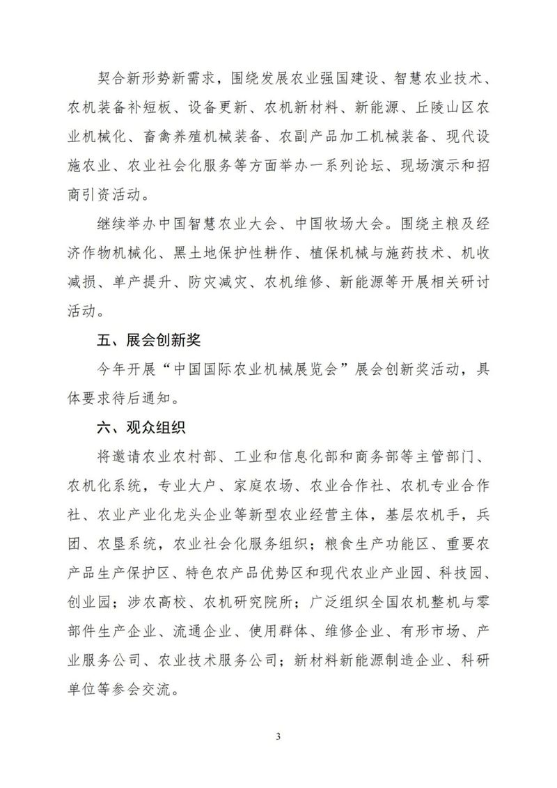 今年开展“中国国际农业机械展览会”展会创新奖活动,具体要求待后通知。