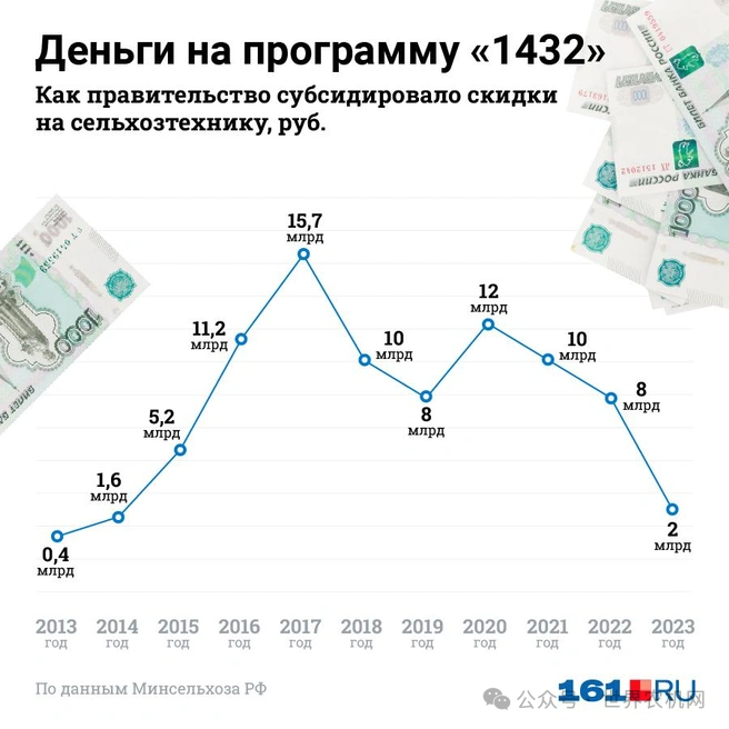 根据“1432”计划提供的对农业公司的财务援助达到峰值后,2023年的国家支持减少了8倍,2024年的减少更为严重。如果以平均值计算,减少了5-6倍,这些数据是按卢布计算的,但没有考虑到卢布在这几年内贬值了两到三倍。