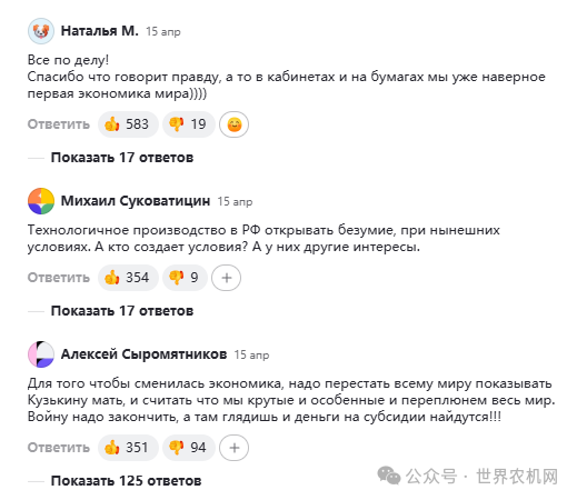 第二个问题是极高的基准利率,这同样损害了投资能力。接下来是燃料价格昂贵。 没有任何条件使我们的农民陷入困境。世界人口在增长,需要的粮食也在不断增加。世界上需要粮食——无论是谷物、肉类还是我们生长和生产的任何其他农产品——都在以巨大的数量进行采购。但是,他们是从我们这里买不到的,而是从美国的农民、巴西、阿根廷、法国的农民那里购买的。他们向国际市场上供应。而我们并没有努力去争夺这些国际市场,相反,我们通过关税和出口困难设置障碍。