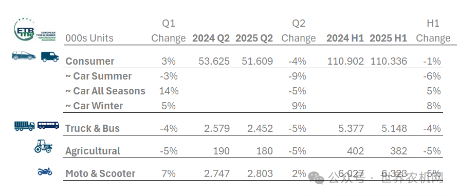 欧洲轮胎和橡胶制造商协会(ETRMA)发布了其成员2025年第一季度和第二季度替换轮胎的销售数据。