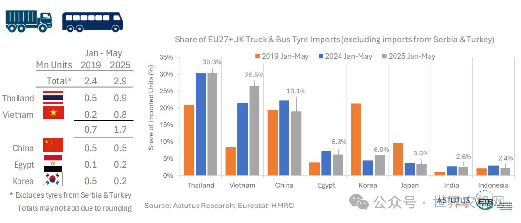 来自欧洲以外地区的卡车和客车轮胎进口(欧盟27国+英国)在2025年前五个月增长了近15%。来自泰国的进口增长与总量同步,泰国仍是主要来源地。来自越南的卡车和客车轮胎增长速度是总量的两倍多,该国占进口量的四分之一以上,高于2024年同期的约五分之一。中国在进口来源地中跌至第三位,低于2024年前五个月的第二位。韩国的份额略有增加,但仍显著低于2019年达到的水平。