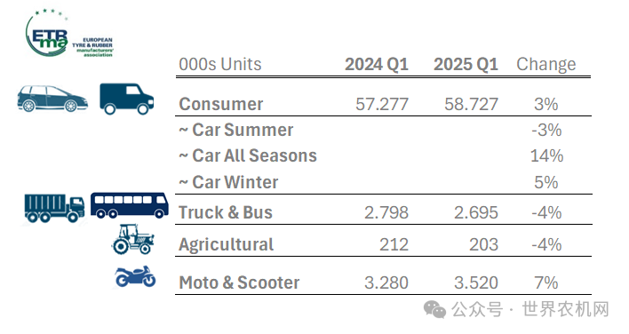 在农业轮胎类别中,自2024年3月以来表现出回暖的积极增长趋势后,2025年第一季度的销量下降了4%,尚未恢复到2019年同期的水平。