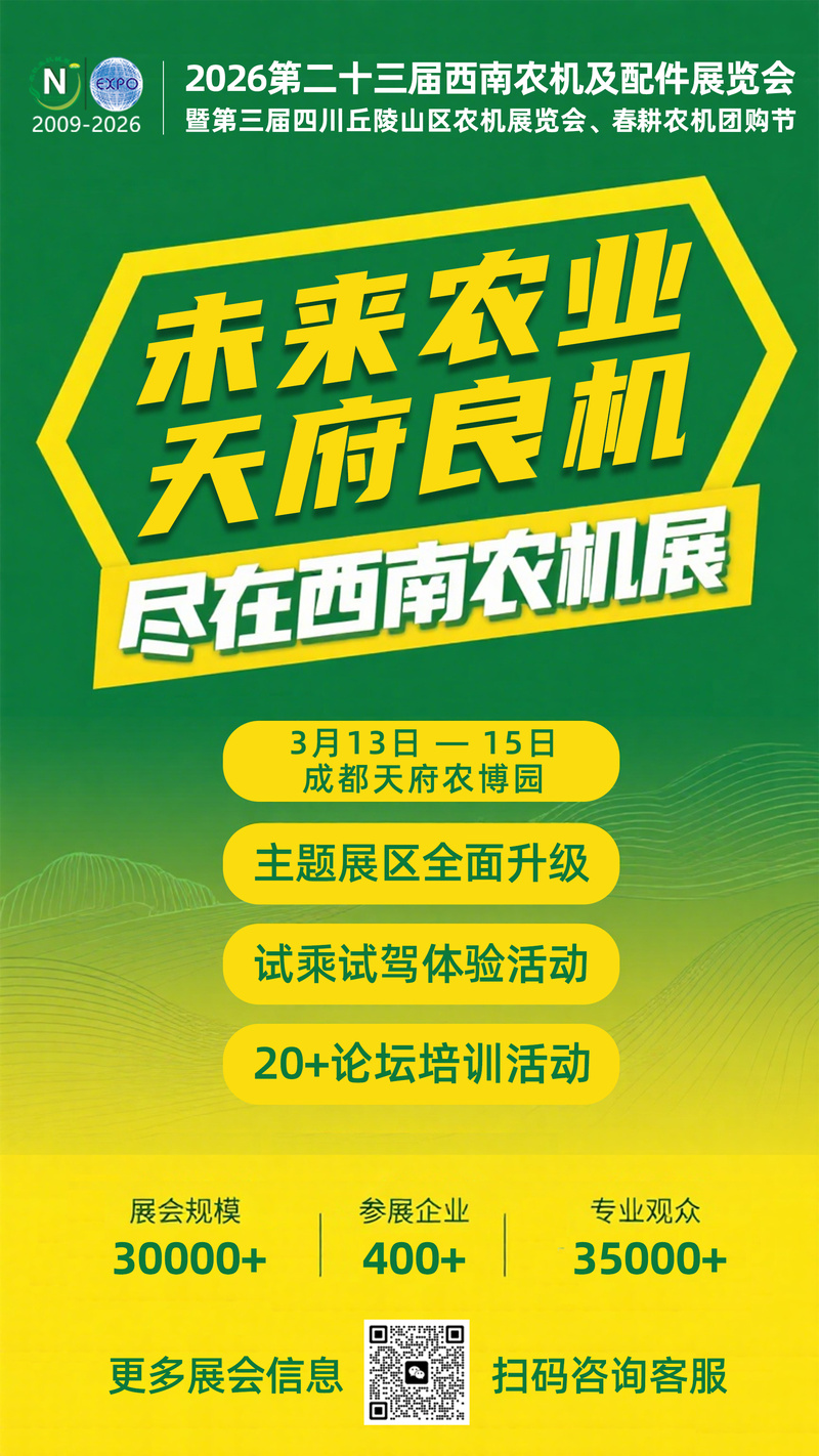 为深入贯彻2025 年中央一号文件“强化农业科技和装备支撑”部署,落实《中共中央 国务院关于进一步深化农村改革扎实推进乡村全面振兴的意见》,推动农机装备高质量发展、老旧农机报废更新、发展智慧农业、拓展技术应用场景,以科技之力促农业繁荣发展。2026第二十三届西南农机及配件展览会暨第三届四川丘陵山区农机展览会、春耕农机团购节将于2026年3月13-15日在成都·中国天府农博园盛大召开。