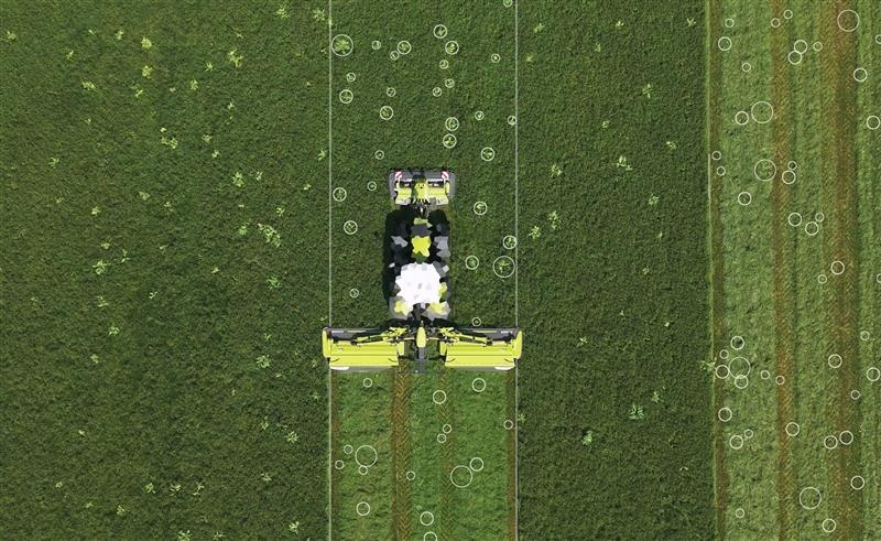 割草过程中,前置割草机上的两台CLAAS CULTI CAM相机检测杂草植株,经AI分析生成分布图后,再通过Amazone作物喷洒机进行点控喷施
