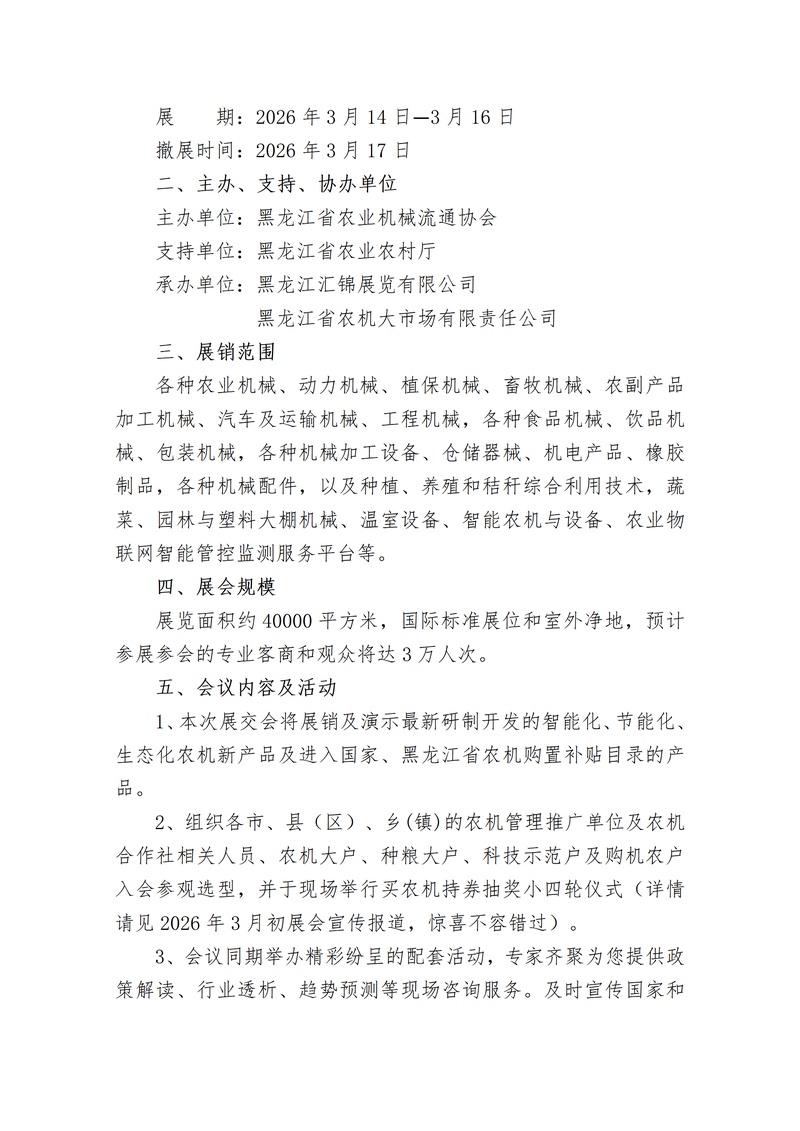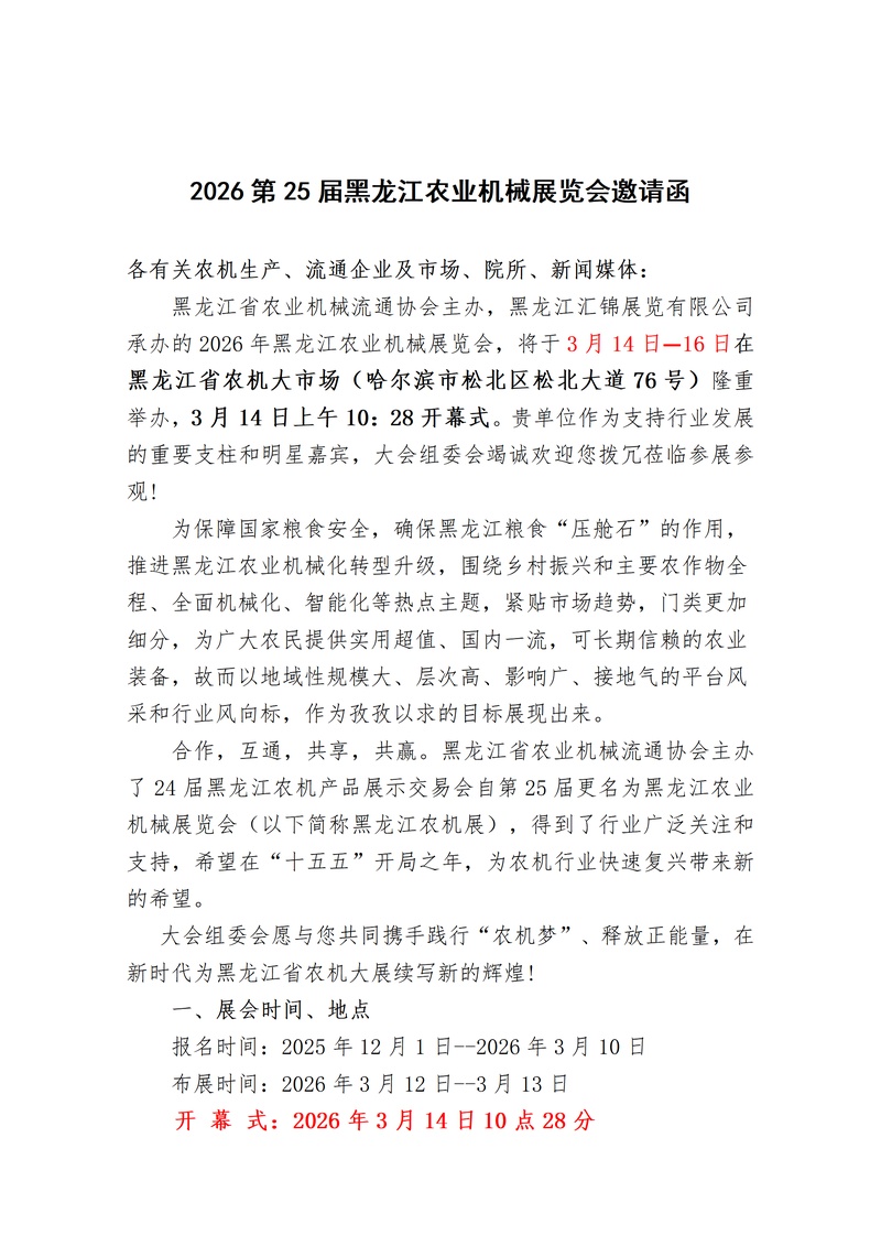 2026第25届黑龙江农业机械展览会将于3月14日至16日在哈尔滨黑龙江省农机大市场举办。展览面积约4万平方米,将设有丰富的展销及专业活动,并组织各级农机用户到会参观选购,旨在打造东北地区规模大、影响广的行业交流与贸易平台。现正面向农机企业及相关单位开放参展报名。