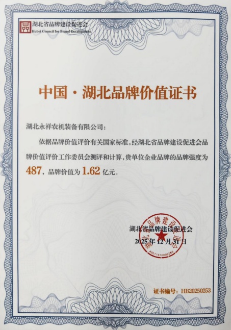 2026 年 1 月 23 日,2026 年湖北品牌建设大会暨湖北品牌年度盛典在武汉东湖国际会议中心召开。大会由湖北省发展和改革委员会、湖北品牌推进机制办公室联合主办,会上揭晓 了2025 年湖北品牌价值评价结果,湖北永祥农机装备有限公司凭借扎实的技术积累、稳定的产品品质与广泛市场口碑,以品牌强度 487、品牌价值 1.62 亿元,成功斩获 “中国・湖北品牌价值证书”。