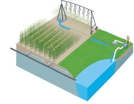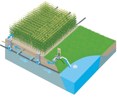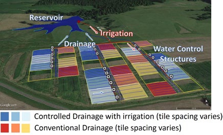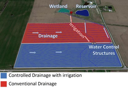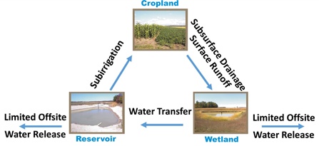 上图是位于富尔顿县的俄亥俄湿地水库地下灌溉系统(WRSIS),田间排水先汇入湿地,再流入水库,之后通过抽水回送至控水设施,实现灌溉再利用。