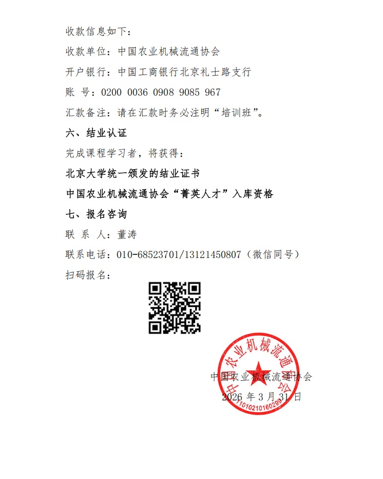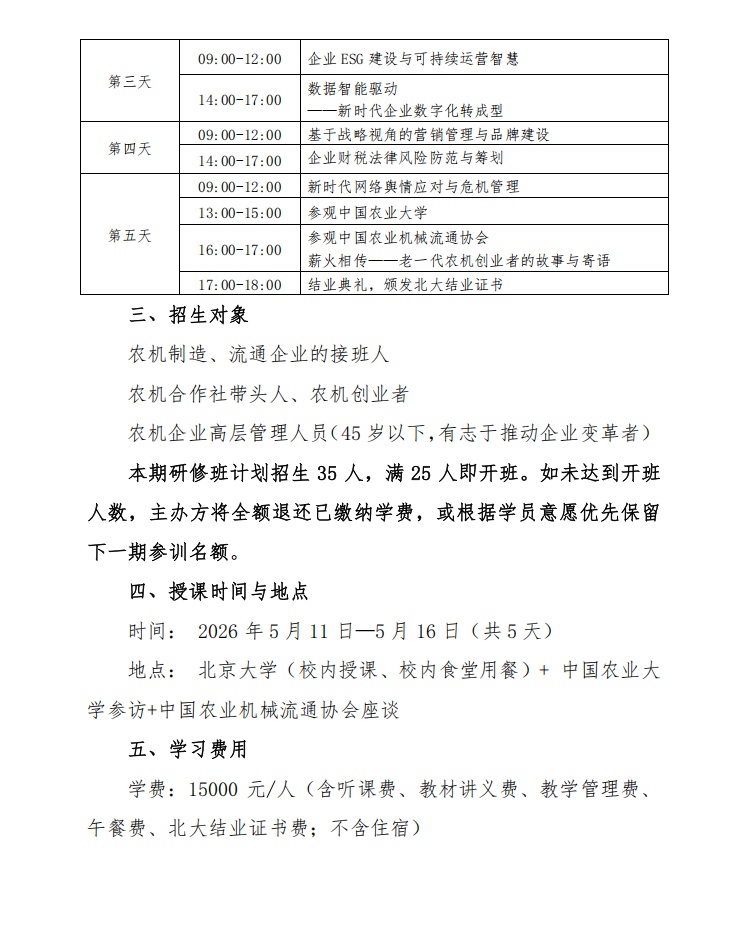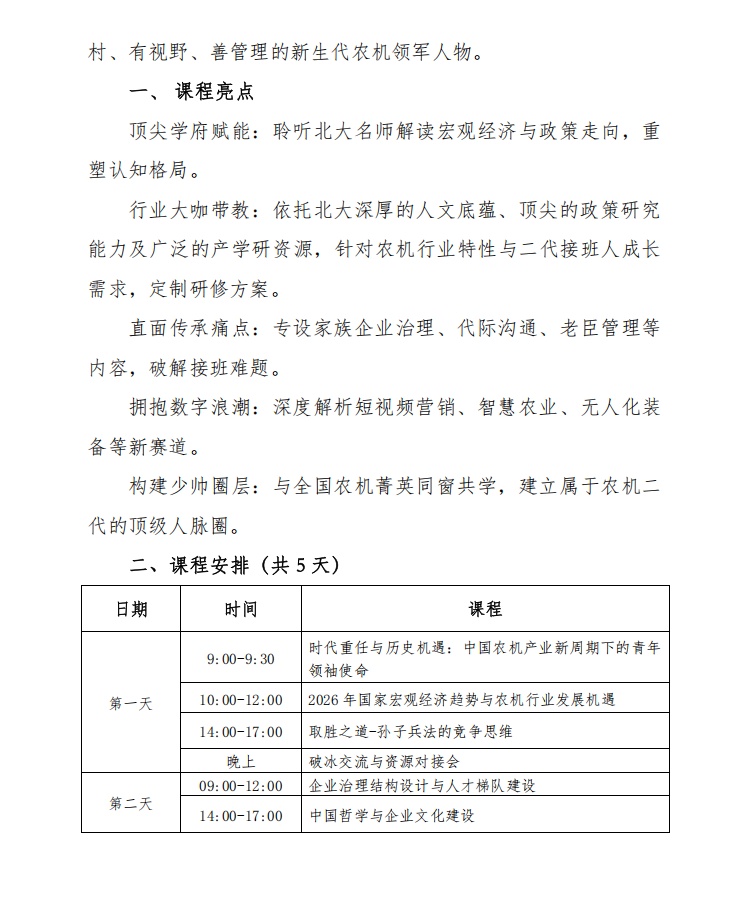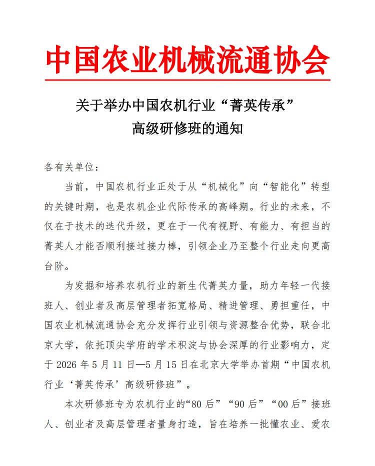 为发掘和培养农机行业的新生代菁英力量,助力年轻一代接班人、创业者及高层管理者拓宽格局、精进管理、勇担重任,中国农业机械流通协会充分发挥行业引领与资源整合优势,联合北京大学,依托顶尖学府的学术积淀与协会深厚的行业影响力,定于2026年5月11日—5月15日在北京大学举办首期“中国农机行业‘菁英传承’高级研修班”。
